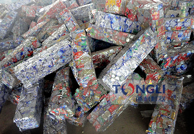 将打包物料置于打包机料箱内,液压油缸工作打压,将打包物料压缩成型,压制成各式金属包块。