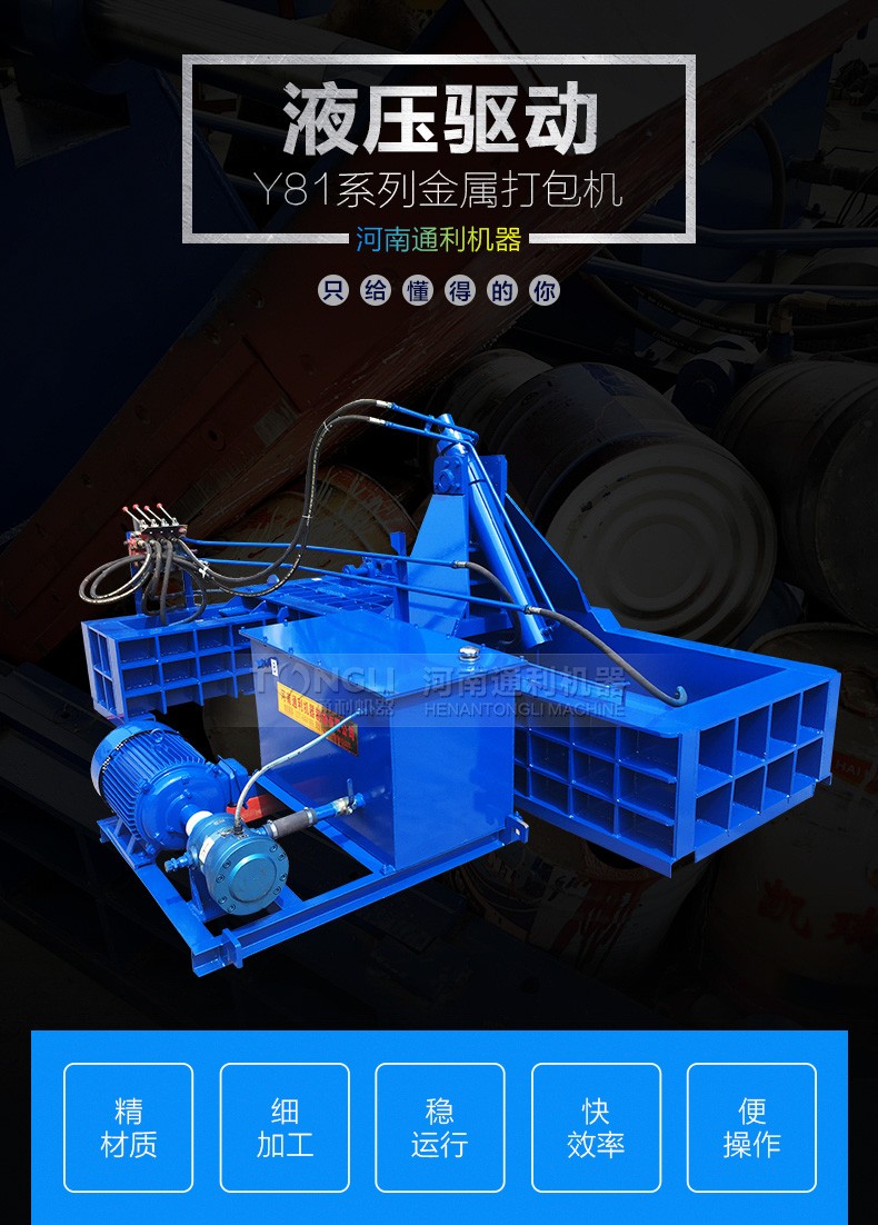 金属打包机可将各种金属边角料、钢刨花屑、废钢、废铁、废铜、废铝、铝刨花屑、解体汽车壳、废油桶等金属原料挤压成长方体、圆柱体等各种形状的合格炉料。便于储藏、运输及回炉再利用。