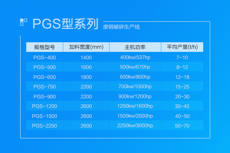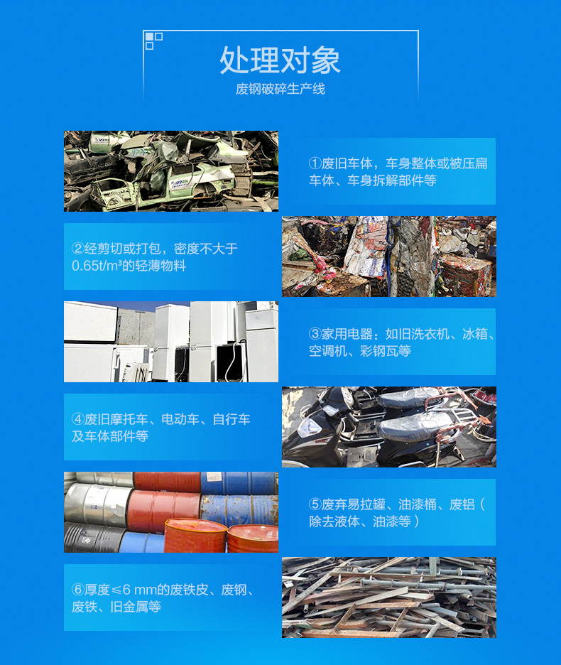 链板式上料输送机、液压控制进料溜槽 、废钢破碎机主机 、振动出料机 、排料皮带式输送机 、上置式磁滚筒 、非磁性出料皮带输送机 、金属料出料皮带式输送机、回转式堆料皮带式输送机
